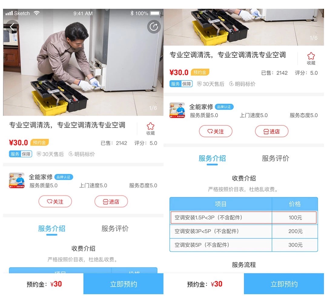 如:维修服务,由于维修过程中所需更换零部件的不确定性,无法提前约定价格,可以选用“预约金”的形式,并规定预约金不退回,从而起到很好的约束和保障效果。另外,对于一般保洁服务,虽然可以提前约定价格,但依然存在跑空的情况,这时可以采用“一口价”的方式,在约定价格的同时,规定一定金额的空单费做为平台和服务人员的时间成本。“免费约”主要是为了降低客户的成本风险,通过价格优势,吸引客户,提高平台的下单率。