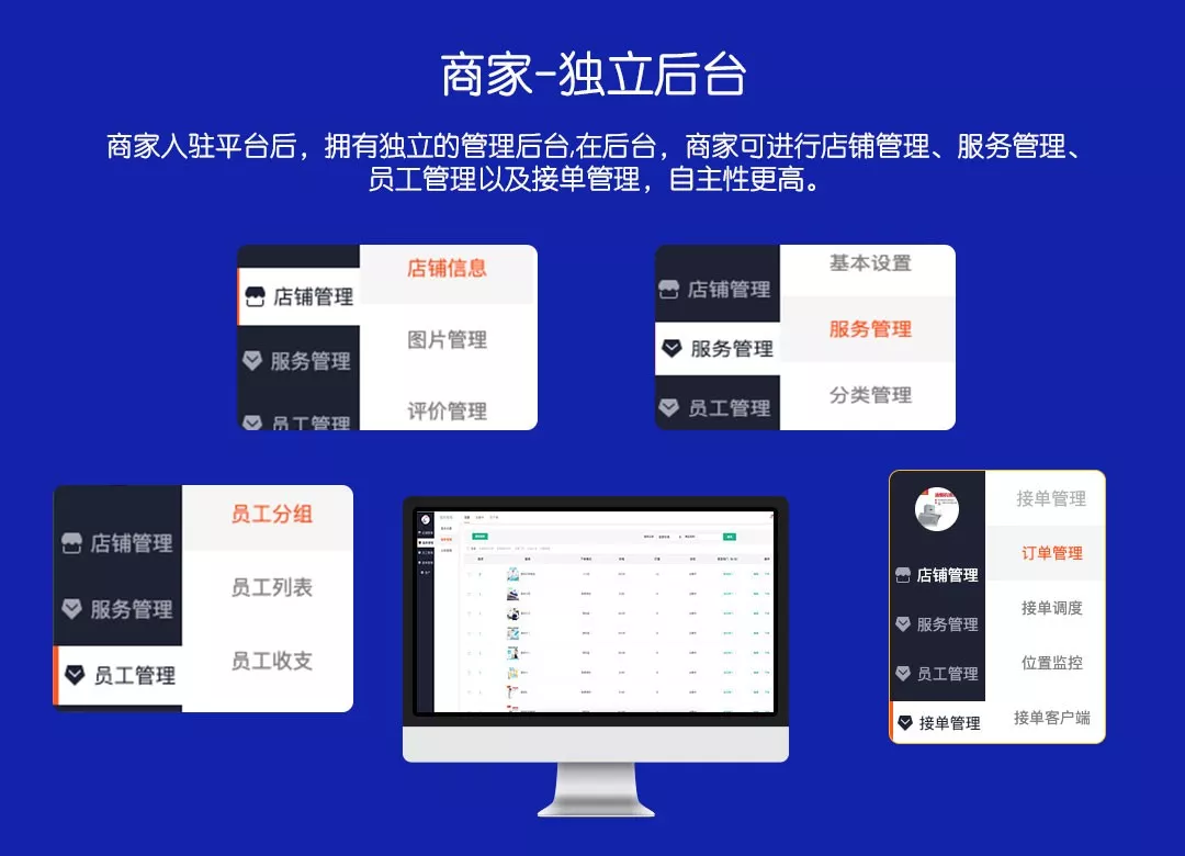 商家入驻平台后,拥有独立的商家后台,通过后台,商家可进行店铺形象管理、服务管理、员工管理、接单管理、资产管理等,自主性更高。商家完成设置后,用户端会生成独立的商家店铺,商家店铺页面展示有店铺LOGO、店铺名称、联系电话、营业时间、地址、具体服务等等,便于用户快速了解店铺,有利于收藏回购,增加复购率。
