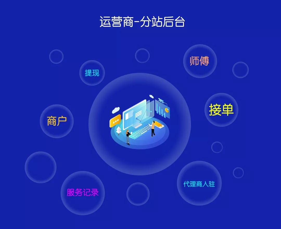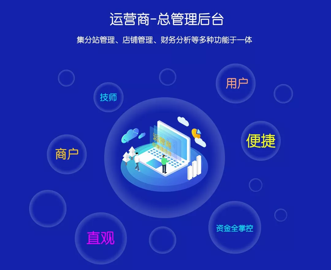 集分站管理、店铺管理、财务分析等多种功能于一体,通过后台即可了解到整个平台的运营情况,实现用户、技师、商户、资金全掌控,直观、便捷。强大的后台管理系统为运营者提供丰富的系统功能和庞大的数据作为运营支持,运营者在PC端操作、管理,更加直观。