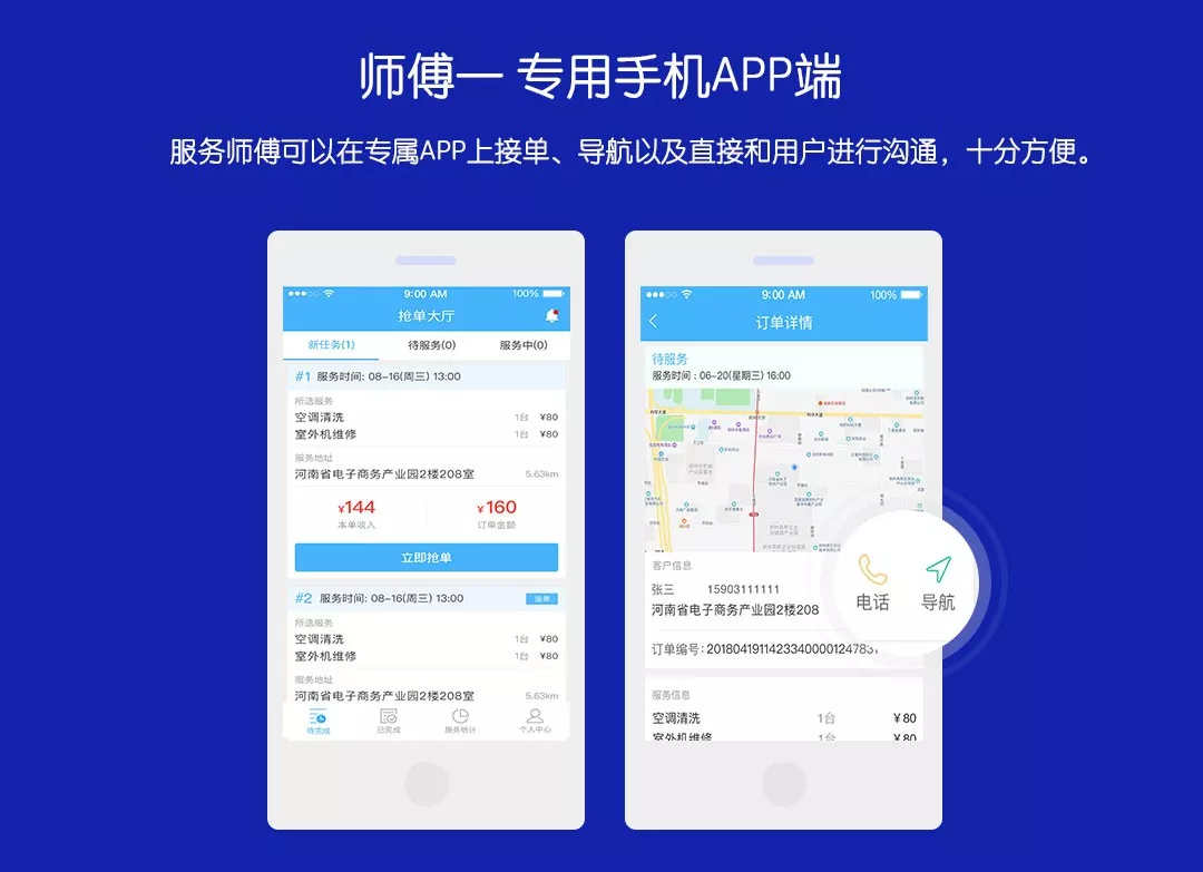接单端以客户端的形式呈现,APP直接接单,提高工作效率,更加便捷。抢单、导航、客户联系、提现、评价查看,一个APP搞定所有,手机操作,体验感更佳。新任务、待服务、服务中,流程简单、明了,即使是文化水平不高的服务人员也能轻松使用。